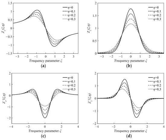 Numerical results of the plasma dispersion function. (a) The real part of the plasma dispersion function; (b) the imaginary part of the plasma dispersion function; (c) the first derivative of the plasma dispersion function’s real part; (d) the first derivative of the plasma dispersion function’s imaginary part.
