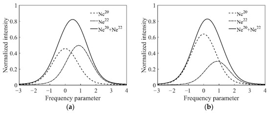 We define the Doppler broadening of Ne20 and Ne22 as , respectively. Since the width of the Doppler broadening is inversely proportional to the square root of the atomic mass, is obtained [19]. Hence, if the Ne20 and Ne22 double isotopes are increased in different proportions, the broadening width and peak gain are modulated.