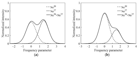Furthermore, there are fourteen kinds of Ne isotopes known to exist, including Ne17 to Ne30 [22]. Among them, Ne20, Ne21, and Ne22 are relatively easy to obtain [23,24]; the other pure isotopes need to be separated from the mantle, air, meteorite, or other sources by some complex physical processes. By using a high-neutron-number Ne isotope, the profile of the intensity tuning curve can be further modulated. For example, the calculations are shown in Figure 4 for the mixed gas of Ne20 and Ne27 in the mixing ratios of 1:1 and 7:3, respectively.
