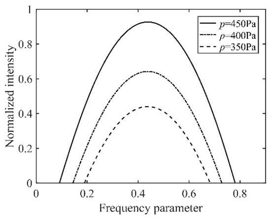 The influence of the inflation pressure on the profile of the intensity tuning curve is complicated. First, it is related to the excitation of the gain medium. For example, the prism ring laser in this paper is excited by the high-frequency discharge (HFD) [25]. The HFD provides the necessary electric field strength to maintain a plasma pole with a relatively low supplied voltage, such as 5~7 V. However, the selection of the ideal inflation pressure for HFD is rigorous. The specific influencing factors related to inflation pressure include η, ℜ, Gm/G0, and k0, presented in Equation (10). η is the ratio of the homogeneous broadening to the inhomogeneous broadening. ℜ represents the stimulated radiation efficiency. Gm/G0 is the ratio of the peak gain of the double isotopes to the peak gain of Ne20. k0 is the ratio of gain to loss. The calculation parameters for Equation (10) are shown in Table 1, under the inflation pressures of 350 Pa, 400 Pa, and 450 Pa, respectively.