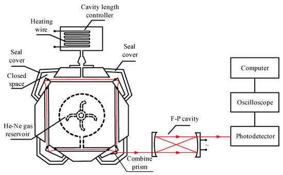 To further identify the factors affecting the gyro intensity tuning curve profile, confirmatory experiments were designed. The experimental system is illustrated in Figure 6. A cavity length controller with heat conduction was designed as the scanning mode unit. The heating wire was made of Ni-Cr alloy, and it was closely wound in the cavity length controller. The cavity length controller, capillary, and seal cover together formed a closed space. The temperature of the dry gas in the closed space was controlled by the heating wire; then, the refractive index of the dry gas was changed by heating, and the optical cavity length of the ring cavity was changed, in order to scan the longitudinal mode frequency.