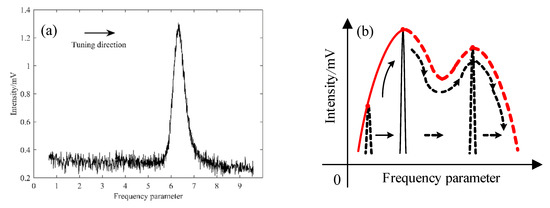 From the prism ring gyro, the light was output through the combing prism and incident into the F-P cavity. The diagram of the longitudinal mode state was obtained from the F-P cavity, as shown in Figure 7a. The axis of abscissas in Figure 7a is the frequency parameter, which represents the oscillation frequency of the longitudinal mode. In order to accurately detect the profile of the intensity tuning curve, the detection scheme is shown in Figure 7b. The voltage applied to the heating wire in the cavity length controller was changed uniformly. Correspondingly, the frequency of the oscillation longitudinal mode was scanned. The intensity amplitude of the oscillation mode was modulated by the profile of the intensity tuning curve. Hence, by tracking the maximum of the amplitude, the profile of the intensity tuning curve was obtained, as shown in Figure 7b.
