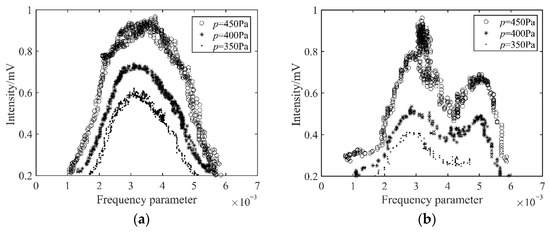 As Figure 3 shows, the Ne isotope ratio of the He-Ne gain medium has a modulating effect on the intensity tuning curve. In Figure 3a, the isotope mixing ratio is Ne20:Ne22 = 1:1, the inflation pressure is 400 Pa, and the profile of the intensity tuning curve is slightly skewed toward the high-frequency parameter side. In Figure 3b, the isotope mixing ratio is Ne20:Ne22 = 7:3, the inflation pressure is 400 Pa, and the profile of the intensity tuning curve is near symmetry.