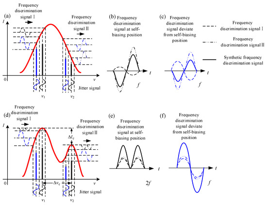 When no modulation was applied to the intensity tuning curve by mechanical jitter, the frequency discrimination signals were modulated by the profile of the similar Gaussian intensity tuning curve, as shown in Figure 9a. Whether the dual modes were located in or deviated from the self-biasing frequency position, the frequency discrimination signals both lacked specificity, as shown in Figure 9b,c. If the modulation approach was taken to the intensity tuning curve, the ideal double peak of the profile was obtained. The frequency discrimination signals were generated from the dual modes in the respective intensity peak positions, as shown in Figure 9d. From Figure 9e,f, we can find that, after the profile modulation, the frequency discrimination signals were specific and suitable for the frequency stabilization. Hence, through the modulation of the intensity tuning curve profile, the stable operation of the double-longitudinal-mode and self-biasing laser gyro may be realized.