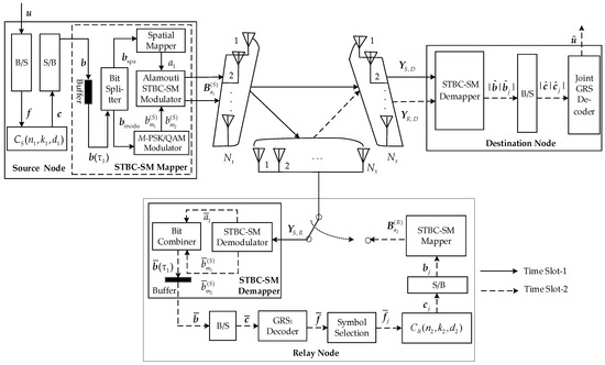 - The DGRSC-STBC-SM scheme is first proposed, where the source and relay nodes use different GRS codes. In the DGRSC-STBC-SM scheme, the relay selects partial symbols from the decoded source information symbols for further encoding. For each selection at the relay, the destination then generates a codeword set through the mutual cooperation between the source and relay.
