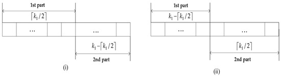- First partition information symbols at the source into two parts. Scenario (i): the first symbols and the last symbols form the first and second parts, respectively, where is the smallest integer larger than or equal to . Scenario (ii): the first symbols and the last symbols form the first and second parts, respectively. The symmetric structures of symbols are shown in Figure 3.