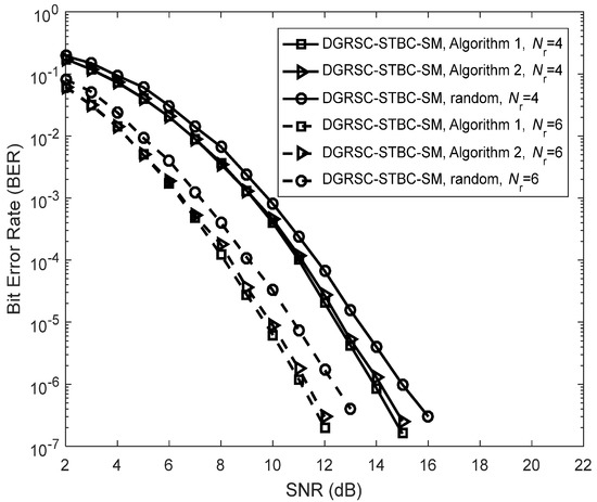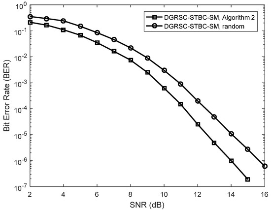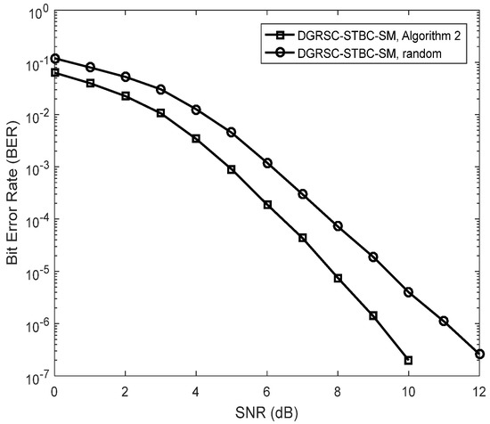 Performance comparisons between the DGRSC−STBC−SM scheme (using Algorithm 2) and the existing RSCC−STBC−SM [22] scheme (using random selection) under the conditions of 4−QAM, , and .