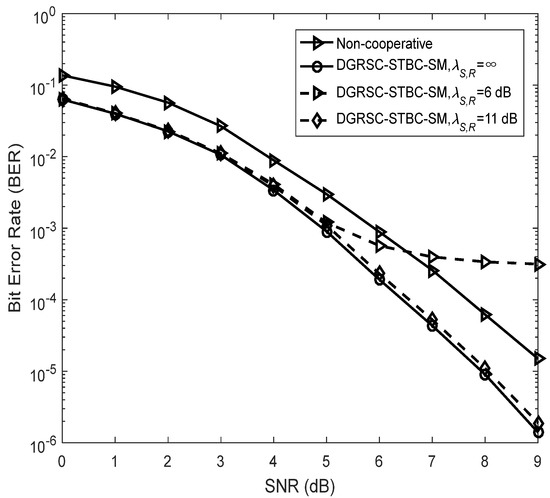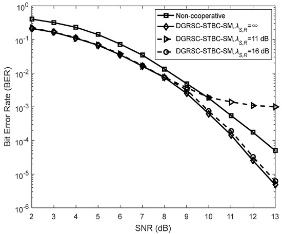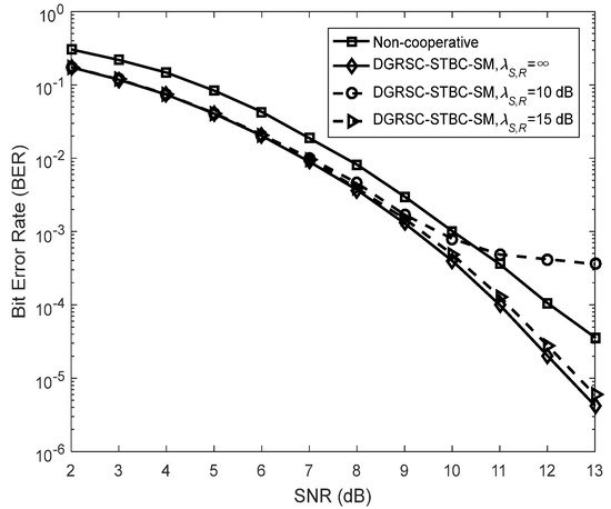 We also analyze the error performance under the non-ideal source-to-relay channel to better see the impact of practical channel scenarios. The results reveal that if the link between source and relay is the non-ideal () link with a larger SNR (i.e., 15 dB, 16 dB and 11 dB), as shown in Figure 7, Figure 8 and Figure 9, respectively, the corresponding error performance is very approximate to that of the ideal DGRSC-STBC-SM scheme. However, if the link between source and relay has a low SNR, i.e., 10 dB, 11 dB and 6 dB, the error performance of the DGRSC-STBC-SM scheme becomes worse, and the error floor is generated at the BER , and , as exhibited in Figure 7, Figure 8 and Figure 9, respectively. The reason for the error floor phenomenon is that the incorrect decoding in the relay brings the error propagation to the common destination. With the aid of cyclic redundancy check (CRC) technology, the error propagation can be further mitigated, and the error performance will show better improvement. Since the detailed contents are beyond the scope of our research, we do not discuss them in this manuscript.
