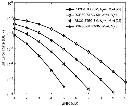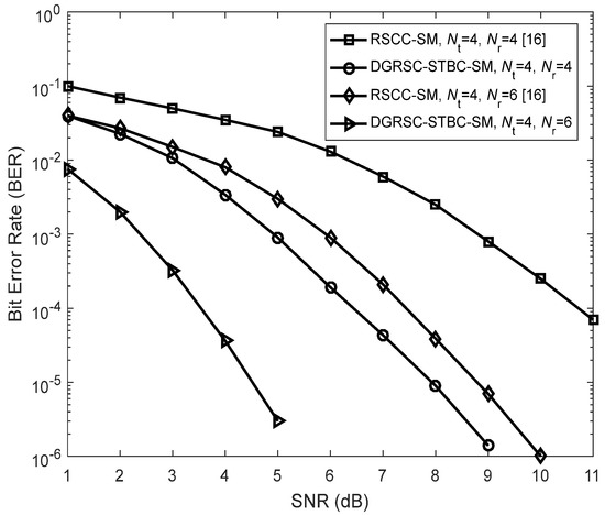 Performance comparisons between the DGRSC−STBC−SM scheme (using 4−QAM and Algorithm 2) and the existing RSCC−SM [16] scheme (using 16−QAM and random selection) under the conditions of , and .