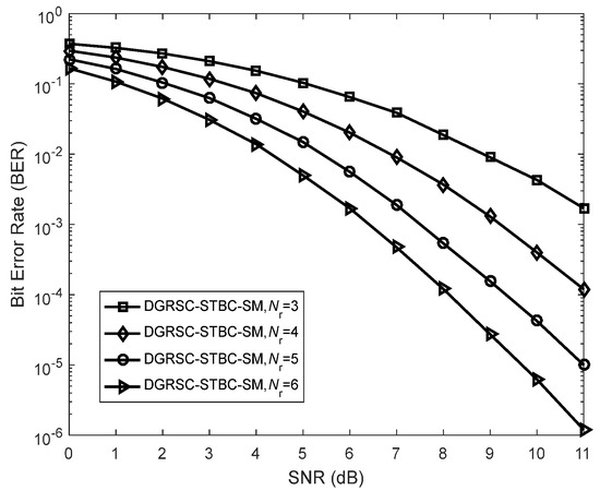 7.4. Comparisons of DGRSC-STBC-SM Scheme with Different Numbers of Receiving Antennas