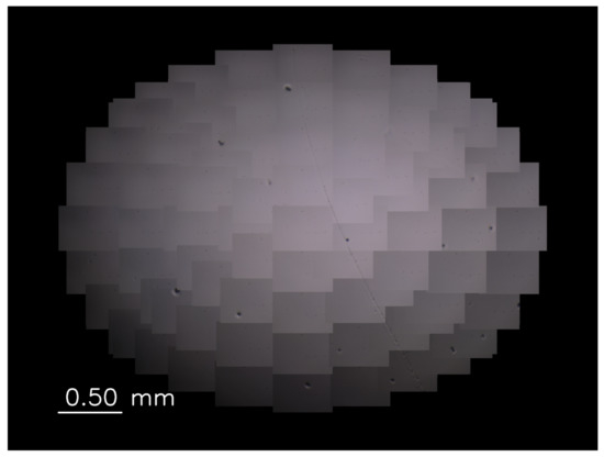 Figure 1 and Figure 2, respectively, show the configuration and an overview of the proposed system. This system consists of an inverted microscope (IX73, OLYMPUS, Tokyo, Japan), a simple microscope unit (KTL-K24C-1, Kyowa Kagaku, Ishikawa Prefecture, Japan), an objective lens (LWD95 mm 10X, Kyowa Kogaku, Sagamihara, Japan), a high-speed camera (MQ003CG-CM, Ximea, Münster, Germany), a dual-axis galvanometer mirror (6210HSM 6 mm 532 nm, Novanta, Bedford, MA, USA), a variable-focus lens (Fast Electrically Tunable Lens EL 10-30-C-VIS-LD-MV, Optotune, Dietikon, Switzerland), a control computer (Windows 7 Professional 64-bit OS, HPZ440 Workstation, Intel (R) Xeon (R) CPU E5-1630 v4 3.70GHz, RAM 16.0-GB memory, HP Japan, Tokyo, Japan), a D/A board PCX-340416 (interface) optical source (high brightness 375 W metal halide, NPI, Tokyo, Japan), a microinjector (FemtoJet 4i, Eppendorf, Hamburg, Germany), and a micromanipulator (TransferMan4r, Eppendorf, Hamburg, Germany). The system acquires a wide range of images without changes in the resolution by sequentially moving the viewpoint through controlling the mirror angle and capturing multiple viewpoints. Since the proposed system combines multiple images taken with an ordinary objective lens, distortion is not a problem in the wide-range images. The pixel resolution of the system is 1 m. In this study, we set the imaging range of the wide-range images to an elliptical region of 3.8 × 2.9 mm (8.66 mm), and the frame rate is set to 1.0 frame per second (fps) by considering that the observation area is a rectangular area of 2.1 × 1.6 mm (3.36 mm) and the maximum velocity of the self-propelled droplets is approximately 150 m/s in [14] to obtain the droplets’ trajectories with sufficient time density for motion analysis. Since the pixel resolution in [14] is 10 m, our system can observe self-propelled droplets with 10 times higher pixel resolution and the approximately 2.6 times larger area.