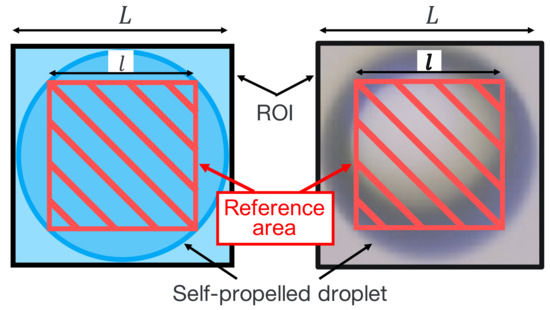 Color information inside the self-propelled droplets is acquired to obtain the chemical reaction information of the droplets. The diameter of a self-propelled droplet r is estimated from the size of the ROI L. The region in which the color information is acquired is set as a square of sides of length l, as shown in Figure 5.