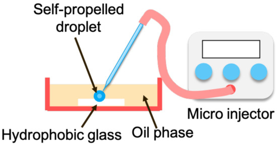 In addition to the systems discussed above, there also exist self-propelled systems based on chemical droplets that contain chemical reaction schemes [5,6,7,8,9,10,11,12,13]. Wodlei et al. developed a self-propelled system consisting of dichloromethane (DCM) and the surfactant cetyltrimethylammonium bromide (CTAB) [5]. The interaction between DCM and CTAB leads to DCM evaporation, which creates a gradient in the surface tension and allows the system to move autonomously. Toyota et al. proposed self-driven droplets that exhibit self-propelled motion in aqueous dispersions of amphiphilic precursors of micrometer-sized 4-octylaniline containing 5 mol of an amphiphilic catalyst [6]. The droplets were fueled by the release of small oil droplets at their rear into the surrounding aqueous solution. Ban et al. constructed a self-driven system for surfactant-containing oil droplets that propelled them at speeds of up to 6 mm/s in the aqueous phase of a NaOH or buffer solution by a driving force based on changes in the interfacial tension due to deprotonation of the surfactant [11]. Čejková et al. compared self-driven systems of decanol droplets floating in a sodium decanoate solution with a mixture of ethyl salicylate and liquid paraffin floating in a sodium dodecyl sulfate solution to confirm similarities in the dynamics of the systems [7]. Miura et al. developed a molecular system to control the self-propelled motion of 4-heptyloxybenzaldehyde oil droplets using a gemini cationic surfactant containing carbonic bonds (2G12C) [8]. Autonomous motion occurred in the 2G12C solution of this system, indicating chemotaxis in a gradient field toward a higher concentration of sodium hydroxide. Lagzi et al. proposed a self-propelled droplet by reproducing chemotaxis with respect to the pH concentration using the chemical reactions between acids and bases and the surface tension [9]. Jin et al. constructed a self-propelled artificial swimming system that exhibits chemotaxis and negative self-motility to move autonomously by interfacial Marangoni flow induced by Micellar solubilization of the oil phase of a surfactant solution. The system was modeled using a one-dimensional diffusion process and stochastic Langevin dynamics [10]. Banno et al. devised an experimental oil-in-water emulsion system in which agglomerated particles composed of imine-containing oil transform into spherical oil droplets that first move autonomously, come to rest, and then form a film-like shape. The system was analyzed in terms of nuclear magnetic resonance (NMR), pH, and surface tension [12]. Hanczyc et al. artificially reproduced chemotaxis by adding fatty anhydride precursors to the oil phase and feeding them into a fatty acid Micellar solution to construct oil droplets that show autonomous and sustained movements through an aqueous medium [13]. Suematsu et al. constructed self-driven droplets with autonomous motion using the Belousova-Jabotinsky (BZ) reaction [14,15].