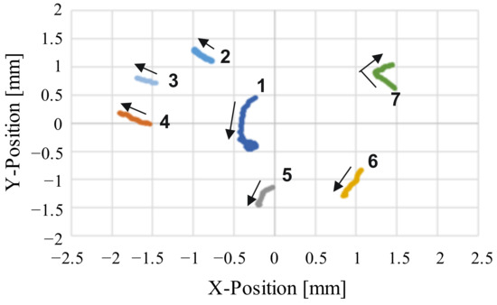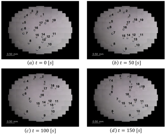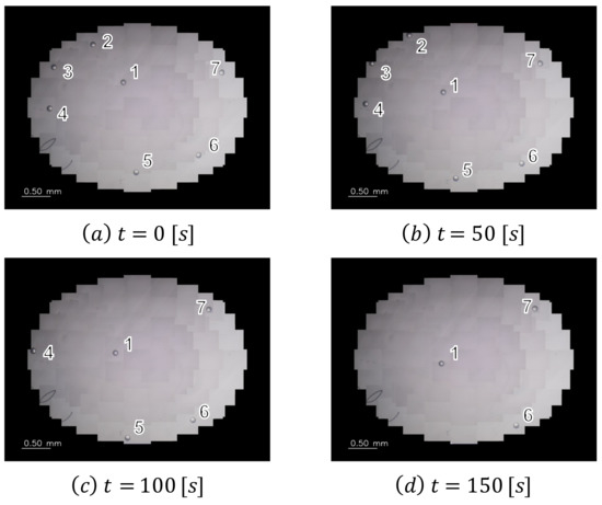 In the verification experiment, the imaging range of the wide-range image was set to an elliptical region of 3.8 × 2.9 mm, the frame rate was set to 1.0 fps, and the motions of the self-driven droplets were recorded for approximately 17 min. Figure 7 shows snapshots of the captured images, and Figure 8 shows the trajectories of the self-driven droplets. The origin of the coordinate system is the center of the wide-range image. In this experiment, the system was able to track the droplets without interruptions for 17 min, during which the experiments were conducted. These results confirm that the proposed system can track multiple self-driven droplets. The proposed visual sensing system can detect self-propelled droplets from a wide range of high-resolution images and analyzes spontaneous movements through a motion tracking algorithm for view-expansive images.