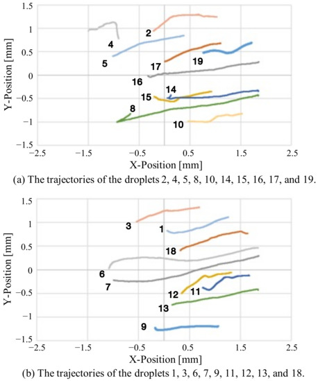 In this experiment, the imaging range of the wide-range image was set to an elliptical region of 3.8 × 2.9 mm, frame rate was set to 1.0 fps, and motions of the self-driven droplets were recorded for approximately 20 min. Figure 9 shows snapshots of the captured images, and Figure 10 shows the trajectory of the self-driven droplets. For visibility, the trajectories have been split into two graphs. The origin of the coordinate system is the center of the wide-range image. These results confirm that the proposed system can track self-driven droplets of multiple colors.