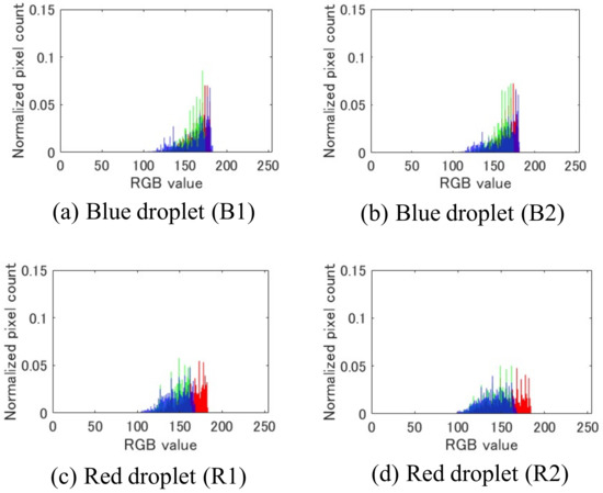 Figure 11 shows the histograms of two blue droplets (B1 and B2) and two red droplets (R1 and R2) obtained using the proposed system. From these histograms, the similarity calculation in Equation (17) yields the following results: