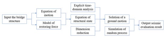 The flowchart of the proposed approach is shown in Figure 1. With an input bridge, the mass, damping, and stiffness matrices are determined, thus obtaining the equation of motion. For a specific bridge, the restoring forces of plastic hinges are determined. With the equation of motion and restoring forces, the implicit equation of motion is converted to explicit expressions based on the equation of state. The explicit equations are solved through explicit time-domain analysis and dimension reduction. The solution of the equations represents the solution of the given bridge under a specific ground motion. To evaluate seismic responses of the bridge under random earthquake excitations, more ground motions are considered based on simulation of random processes, which generates different samples of ground motions. For each sample of ground motions, the nonlinear dynamic response of the bridge is analyzed using the proposed approach. Finally, the statistical result of the seismic response of the bridge is delivered as the output.