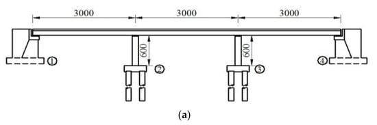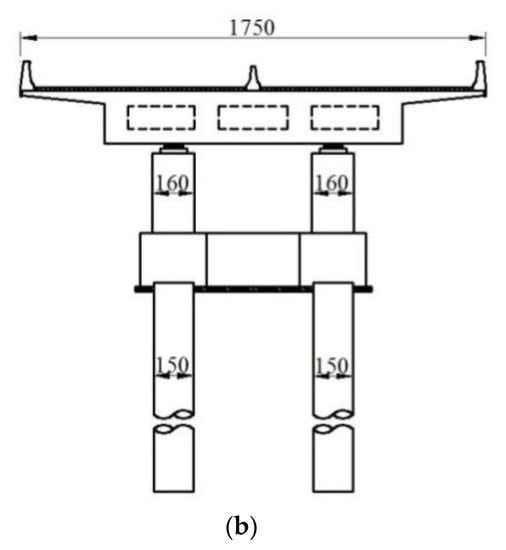 There is a 3 × 30 m prestressed concrete continuous girder bridge on a certain first-grade highway (the elevation layout is shown in Figure 4a). Its basic parameters are as follows. Bridge width is 17.5 m. The cross-section of the main girder, 2 m in height, adopts a single box with three cells. The double-column piers with circular solid sections are 6 m in height and 1.6 m in diameter, with its pile foundation 1.5 m in diameter. The bridge abutment is a U-shaped gravity one with an enlarged foundation. Fixed pot bearings are set on the No.② pier (denoted as P2), and movable bearings are set on the other piers or abutments. The overall cross-section layout of the bridge is shown in Figure 4b.