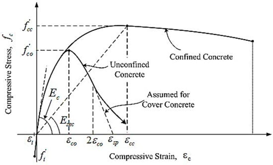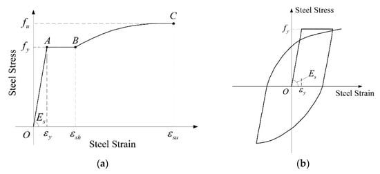 The whole bridge model is established with OpenSees. The section type of the model is selected as “fiber section”, and the element type as “element BeamWithHinges”, which can be used as the carrier of the centralized plastic hinge analysis. The non-confined concrete is divided into 2 parts in the radial direction and 18 parts in the circumferential direction. The confined concrete is divided into 4 parts in the radial direction and 18 parts in the circumference. The Mander model is adopted for the constitutive model of constrained and unconstrained concrete in this analysis, as shown in Figure 5. The constitutive model of the reinforcement adopts the Kent–Part model, which is suitable for repeated periodic loads, such as seismic load, as depicted in Figure 6. The parameters of concrete and steel bars calculated according to the model are shown in Table 2 and Table 3. The model constraints are handled as follows: the pier bottom is simulated by a consolidation mode, the connection between pier and beam by an ordinary elastic bearing, and the connection between abutment and beam by an ordinary constraint mode. After the above work, the parameters involved in the Bouc–Wen model are input, the output response index is defined, and then the ground motion parameters are defined. In this process, a large number of seismic loads are input, and finally the calculation and analysis are carried out. Since the focus is on the explicit iterative method applied to the rapid evaluation of seismic performance of continuous girder bridges, soil–structure interaction is not considered.