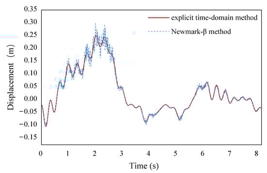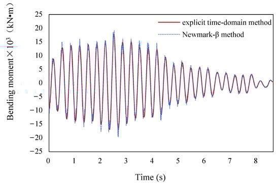 When the ground motions are applied to the bridge, the calculation results are shown in the figures below. Figure 8 shows a time-history diagram of the bending moment at the bottom section of P2 where plastic hinges are formed. Figure 9 shows displacement time-history diagram at the top section of P2. It can be seen that the calculation results which are generated by the two methods mentioned above—the explicit time-domain dimension-reduced iterative method and the Newmark-β method—are basically consistent with each other. They are almost coincident at most moments, and the maximum error remains within 10% (the error is defined as the absolute value of the difference between the two methods divided by the calculated value of the Newmark-β iterative method), which verifies the accuracy of the explicit time-domain dimension-reduced iterative method in this paper. Throughout the analysis, the numerical stability of the explicit method is always checked. After several analyses, it is shown that the dimensionality reduction iteration has good stability and can be used to analyze local nonlinear random response problems.