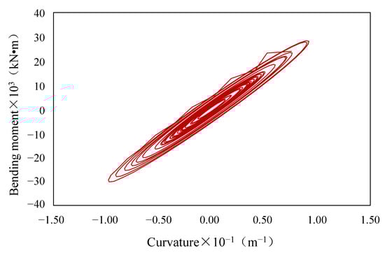 According to Clause 3.4.2 of Reference [], for B-class bridges, the energy dissipation part is mainly located at the pier under the action of an earthquake, and the potential plastic hinge area of the double-column pier is at the pier bottom. In this paper, the plastic hinge is also set to form at the bottom of the pier. In accordance with the cross section and reinforcement, the moment–curvature relationship of the pier section is plotted in Figure 7. The yielding force is Fy = 4169 kN/m. The initial stiffness is K0 = 4169 kN/m. After yielding occurs, the stiffness is Ky = 41.69 kN/m.