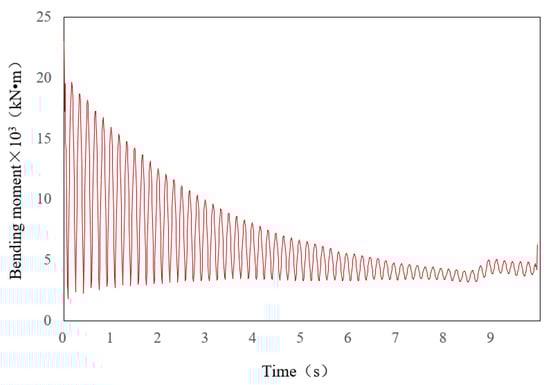 The average, standard deviation, and maximum value of structural response are needed to evaluate the seismic performance of the bridge structure under random earthquake action. Table 6 shows the statistical values of bending moment at the bottom section of pier 2 under the excitation of 500 groups of displacement time history, the average value, the average value of the standard deviation, and the average value of its absolute maximum, which can be calculated by Equations (22)–(25). Taking the standard deviation time-history curve of the bending moment as an example, which is shown in Figure 11, the standard deviation value changes greatly at the beginning, but it becomes stable after a period of time. When the statistical values are obtained, the seismic performance evaluation of the bridge can be carried out.