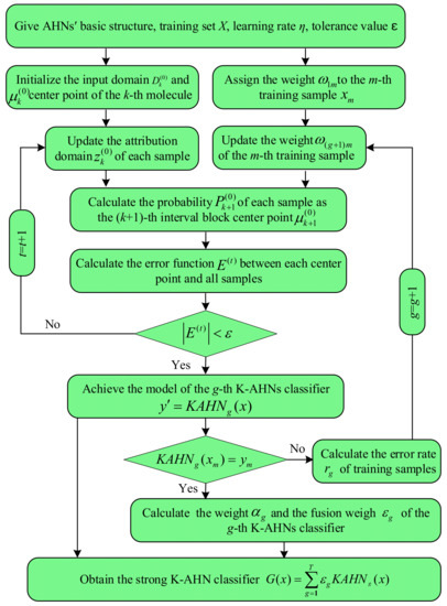 where KAHNg(·) is the output result of the g-th K-AHNs classifier and wgm is the weight of m-th sample in the g-th K-AHNs classifier. While the error rate rg is determined, the weight αg of the g-th K-AHNs classifier can be calculated for comprehensive evaluation, as follows: