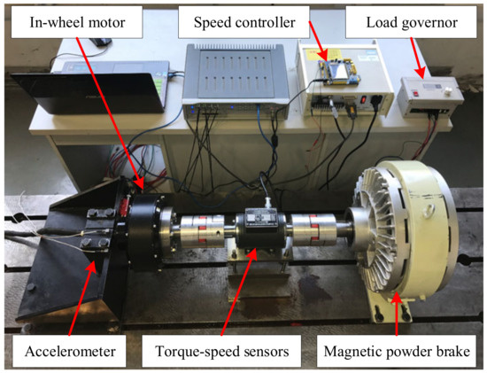 With the outbreak of the oil crisis, many policies and measures have been introduced to promote the development of the new energy vehicle (NEV) from countries all over the world. As a result, many new driving technologies have become research hotspots, one of which is the in-wheel motor (IWM), which has the advantages of high efficiency, fast response, and full-time wire control. The IWM-based driving system can reduce vehicle energy consumption, improve vehicle performance, and optimize spatial layout. Therefore, the IWM-based driving system has been recognized as the ideal configuration of future NEV power systems [1,2]. However, the unique installation between the IWM and the suspension must increase the unsprung mass of a vehicle, whereby the vibration isolation performance of the suspension is deteriorated, and the operational stability and safety are compromised. Moreover, as each IWM must directly withstand the intermittent strong impact load from the road, its local structure, such as the bearing, can be broken very easily, and it is difficult to detect the subtle damage. At present, there is no system for monitoring the IWM’s condition. Once a fault occurs to one or more of the IWMs in the driving system, local driving performance should deteriorate, which creates a security threat for the safe operation of the whole vehicle [3,4]. Therefore, it is urgent to explore efficient and reliable diagnosis methods for monitoring IWM’s fault condition [5,6,7].