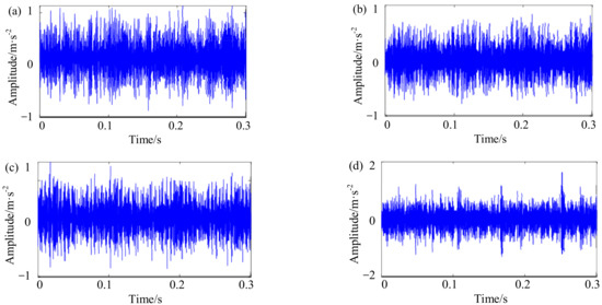 Figure 5. Vibration signals of four IWMs at the rotating speed of 700 rpm and load torque of 30 N·m: (a) State 1—normal state; (b) State 2—rolling element defect; (c) State 3—inner ring defect; (d) State 4—outer ring defect.