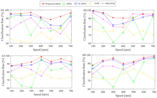 To reveal the effectiveness of the proposed method, four existing classifiers, the AHNs, K-AHNs, SVM [49], and the particle swarm optimization-based SVM (PSO-SVM), [50] are employed to build the diagnosis system. Here, the basic parameters of the AHNs and the K-AHNs are set as double-optimized AHNs. In this paper, two methods of the SVM and the PSO-SVM directly select the same configuration parameters of the relevant references to establish the classification systems, respectively. For example, Ref. [49] used the SVM with the Gaussian RBF function and the width parameter of 0.4, while Ref. [50] set the parameters of the PSO algorithm, such as two acceleration factors of 1.5, weight coefficient of 1, maximum iterations of 40, and population size of 20, to determine automatically the two key parameters of the SVM. Moreover, the same training samples above were used to train the classifier based on each method, then the same test samples were regarded as an unknown state to verify the classification performance of each method. The corresponding diagnosis results are shown in Figure 6.