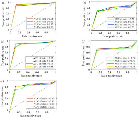 Figure 7. The ROCs and AUCs of the bearing states from the self-made IWM test stand by five methods: (a) proposed method, (b) AHNs, (c) K-AHNs, (d) SVM, (e) PSO-SVM.