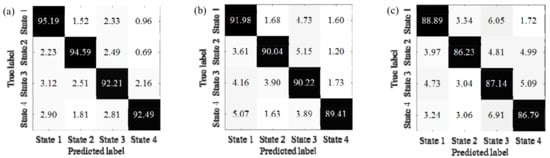 Figure 8. The confusion matrixes among IWM’s bearing states by different methods: (a) proposed method, (b) K-AHNs, (c) PSO-SVM.
