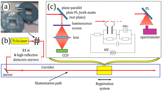 In all three cases (free propagation, 1 and 3 mm cell meshes), we identified the position and elongation of the high-intensity zone. Along the propagation coordinate z, we recorded the transverse fluence distributions by the CCD-camera Ophir Spiricon SP620U, pulse spectra by a spectrometer Avesta ASP-150, and monitored the possibility to trigger a high-voltage discharge (Figure 1c). During the measurements of the beam distribution and pulse spectrum, we reflected the beam from the plane-parallel plate (PL) with one opaque surface to avoid the damage of the CCD camera and the spectrometer. We directed to the spectrometer radiation reflected from the opaque surface of the PL, thus providing registration of the spectrum integrated over the beam. For the beam visualization, the laser radiation was reflected from the smooth surface of the PL onto a luminescent screen while the opaque surface prevented Fresnel reflection from the rear surface of PL. The luminescence was projected to a CCD camera by an objective lens. Technical details on measurement techniques used can be found in [45].