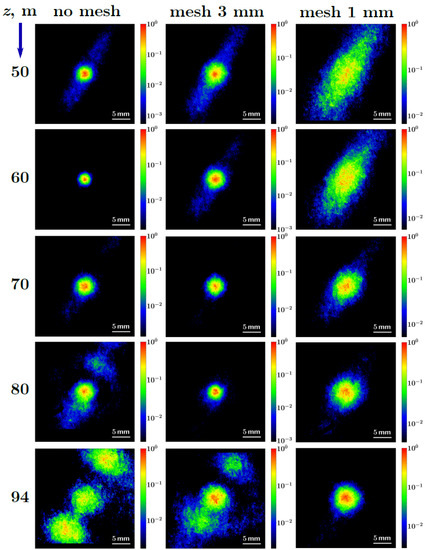 Figure 2 shows typical transverse fluence distributions of the radiation, each of which is normalized to its maximum, at several distances z in the range from 50 m to 94 m in the case of free (left column) and regularized by meshes with 3 mm (middle column) and 1 mm (right column) cells propagation. A relatively clean circular beam mode was observed at the distance m for a free beam. When the beam was regularized by mesh with 3 mm cell size, a clean beam mode appeared at the distance of about 70 m. In the case of 1 mm sell size mesh regularization, the beam mode “cleaning” started at the end of the propagation path ∼94 m. So, the beam regularization by the mesh leads to the shift of the distance of circular beam pattern formation. The smaller the mesh cell size, the further in the propagation path the circular beam pattern is formed.