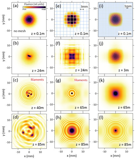 The evolution of the transverse profiles of the laser beam fluence with propagation distance z is shown in Figure 3, the left, middle and right columns correspond to the free propagation without mesh, 3 mm mesh and 1 mm mesh, respectively. Each fluence distribution shown in Figure 3 is normalized to its maximum. In the case of free propagation, the self-focusing squeezes the beam at the initial stage of propagation m. This effect is clearly pronounced despite beam defocusing m (cf. Figure 3a,b). In contrast, at the same initial stage, the effect of linear diffraction is significant for the beam after the mesh. First, the change between minima and maxima similar to the Talbot diffraction is clearly seen for the 3 mm cell (cf. Figure 3e,f). Second, the laser beam transverse modulation by meshes causes considerable increase in the global beam divergence as compared to the free propagation due to the strong diffraction on the mesh wires. For example, at m, the free propagated beam is localized within an area of 14 mm in diameter (Figure 3b), while in the case of the 3 mm mesh, the radiation is distributed within a circle of 24 mm in diameter (Figure 3f).