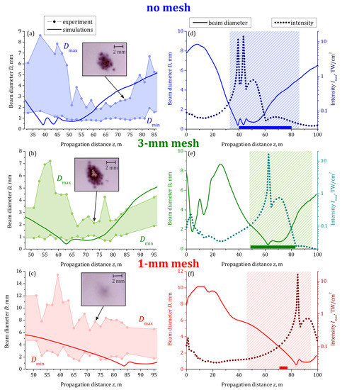 Dependencies of minimal and maximal measured out of 16 laser shots beam diameters (circles) on the propagation distance z in comparison with the beam diameter obtained from simulations (solid curves) for different modulation regimes: without modulation ((a), blue), using 3 mm ((b), green) and 1 mm ((c), red) meshes. Sixteen measured at the certain propagation distance z diameters lie between and inside the filled area in (a–c). Insets in the left column show images of burns on the photographic paper at m. (d–f) Dependencies of beam diameter (solid curves) and maximal intensity (dotted curves) on propagation distance z obtained in simulations in the range of z from 0 to 100 m for all three cases. Colored rectangles highlight the regions shown in left column. Color bands in lower part of (d–f) demonstrate the range where the laser pulse triggered the electric discharge.