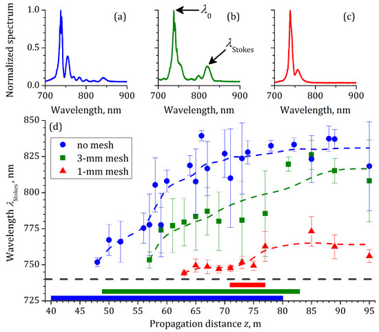 Another method to identify the high-intensity zone is the measurement of the supercontinuum spectra at the different distances z along the propagation path. In our previous work [43], we observed the consistent formation of the infrared humps in the radiation spectra of the postfilament channel. The examples of the multi-hump spectra recorded at m without a mesh, with 3 mm mesh, and 1 mm mesh are shown in Figure 5a–c, respectively. That the broadband supercontinuum was strongly modulated in the infrared part of spectrum is clearly seen in three cases studied. We measured the spectra at different propagation distances z and obtained from each spectrum the wavelength of the most long-wavelength hump, see Figure 5b. The dependencies for the three cases studied are shown in Figure 5d. The infrared humps start to emerge at , 57 and 73 m in the cases of the mesh absence, 3 mm mesh, and 1 mm mesh, respectively. These z-positions are slightly further than the onsets of the discharge triggering zone, cf. markers and bars of the same color in Figure 5d. Nevertheless, they demonstrate the same behavior: the delay of the beginning of the high-intensity zone is associated with the decrease of the cells in the mesh.