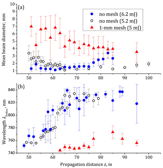 In principle, the observed shift of the high-intensity zone can be caused by the pulse peak power decrease due to the absorption induced by the mesh. We studied the influence of the pulse energy on the high-intensity zone localization by decreasing the pulse energy down to 5.2 mJ, i.e., approximately the amount remained after 6.2-mJ pulse passes through the 1 mm mesh. We sent the free 5.2 mJ beam into the corridor and measured the dependencies on the distance z of the beam diameter D and the wavelength of the most long-wavelength hump. The dependencies and are almost identical for the free propagation of the 5.2 and 6.2 mJ pulses, cf. open gray and filled blue circles in Figure 6, while the ones for the 1 mm mesh regularization differ from the case of the free beams dramatically, see red triangles in Figure 6. Therefore, the segmentation of the beam plays a dominant role as compared to the energy loss.