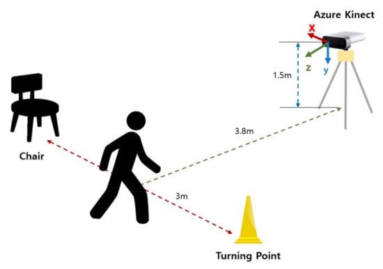 System configuration for the study. The participants performed a 3 m TUG test. A cone was placed at 3 m straight from a standard chair, and Azure Kinect was installed perpendicular to the walking direction at the height of 1.5 m.