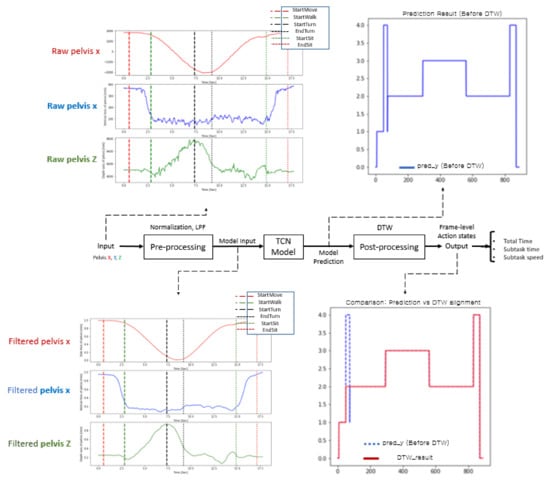 Figure 2 shows the overall process of the proposed method with typical time plots in each process. The raw trajectories (e.g., pelvis x, y, and z) are the normalized preprocessor inputs, and a low-pass filter (LPF) was used for the deep model training with the dilated TCN model. The predicted frame-level action states were postprocessed by dynamic time warping (DTW) to modify the misclassified action states. Finally, many action capabilities were computed for the total time, subtask times, subtask speeds, etc.