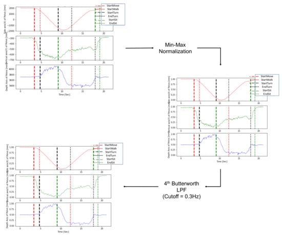 During preprocessing, an LPF was applied to remove noise generated during measurement, and min-max normalization was sequentially performed to normalize diverse ranges of subject data. Normalization of the trajectories is necessary because various height differences between subjects generate a diverse range of trajectories in the TUG data. In addition, to solve the problem of direction mismatch caused by camera coordinates, axis matching was performed to update the coordinates according to the subject’s walking direction [37]. Figure 3 shows an example of preprocessing for the pelvis trajectories. The optimal cutoff frequency selected by trial and error was 0.3 Hz, and the min-max normalization technique was finally utilized together by applying the 4th Butterworth LPF.