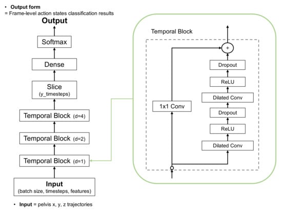 The dilated TCN uses a deep series of dilated convolutions instead of pooling and up-sampling, adding skip connections between layers. Each layer uses dilated filters that operate on only a small number of time steps. The dilated TCN has the following properties: (1) computations are performed layer-wise, which means that every time step is updated simultaneously; (2) convolutions are computed according to the time; and (3) predictions at each frame are a function of the receptive field. Figure 4 shows the architecture applied to the proposed TUG subtask segmentation. The normalized and filtered trajectories were input to the first temporal block. Three temporal blocks generated features, and the softmax activation function in the final layer output the frame-level action state classification results.
