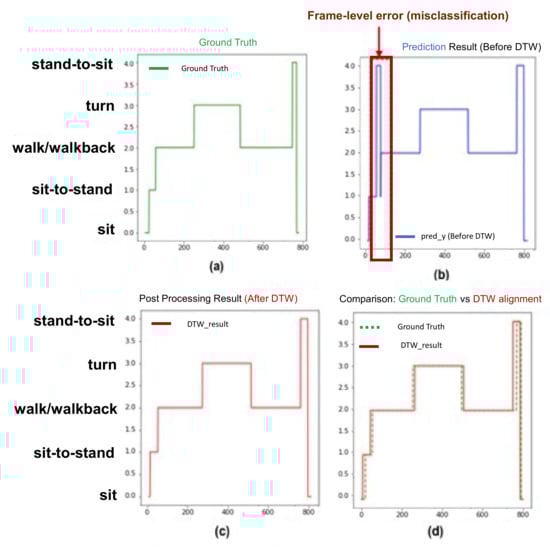 Figure 5 shows the example of the postprocessing for correcting the frame-level misclassifications. The green line represents the ground truth, the blue line represents the model classification result before postprocessing, and the red line represents the model classification result after DTW. In Figure 5a, the index of the y-axis represents each subtask, in which the walk and walk back subtasks existing between the turn subtasks are marked on the same index. Figure 5 shows the results before (Figure 5b) and after (Figure 5c) the DTW algorithm. Figure 5d shows the ground truth (green line) (Figure 5a) and the result (red line) (Figure 5c) from the DTW. Comparing Figure 5b,c illustrates that the prediction model incorrectly classified the “sit-to-stand” (index = 1) to “stand-to-sit” (index = 4) for the state transition from “sit-to-stand” to “walk” (index = 2). After the DTW was applied, this misclassification disappeared.