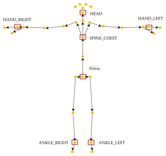 Figure 6 shows the total 32 skeleton joints detected using Azure Kinect. Among these, previous automatic TUG research with wearable sensors, such as a single IMU, argued that the proximal location of sensors (e.g., at the lower back) could more accurately detect the main gait events and spatiotemporal and kinematic factors [2,43]. Additionally, according to Sprint’s automatic TUG test research survey [2], 55.56% of wearable sensors, such as IMUs, are attached to the lower back. These findings motivated us to speculate that similar locations might be better than other locations in the TUG subtask segmentation task by using a lower resolution of RGB-D than the IMU. Previous studies using RGB or RGB-D cameras used complete skeleton data spread throughout the body as inputs to ANN models or rules [18,22,42]. We hypothesized that the input(s) only from the proximal joints, for example, center of gravity (COG) movement or head motion, and not with all 32 skeleton joints, should be sufficient for classifying TUG subtasks. Therefore, only five inputs (red box) were investigated for input comparison in this study because the accuracies of skeleton joint motion from the distal joints, such as ankles and hands, are usually very low due to fast movements and a wide range of motion. Using a smaller number of feature points can also significantly reduce the processing time in the inference phase, which is important for edge computing on mobile devices.