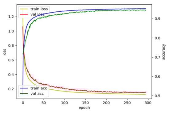 To find out the optimal hyperparameters, we used the grid search method: a heuristic approach. We considered the following hyperparameters: (1) learning rate in the interval of {0.00001, 0.00005, 0.00007, 0.0001, 0.0003, 0.0005}, (2) optimizer in the interval of {Adam, RMSprop}, (3) patience in the interval of {10, 20, 30, 50, 70, 100}, (4) batch size in the interval of {32, 128, 256, 512, 1024, 2048}. From this optimization process with the categorical cross-entropy loss in the proposed dilated TCN training, optimal parameters were determined as a learning rate of 7 × 10 − 5, optimizer of Adam, patience of 50, and batch size of 1024 to segment the TUG subtask (e.g., a multiclassification task). Figure 7 shows the behavior of loss and accuracy with the pelvis input. The best model was obtained using an early stopping criterion; the training will stop if the validation loss is not updated for a specific epoch (patience). Datasets were split into 6:2:2 (training: validation: test) to train the dilated TCN network for TUG subtask segmentation, e.g., (30: 10: 10) for 50 older adult datasets. To prevent overfitting, the model stopped training early when the validation loss did not improve during 50 epochs.