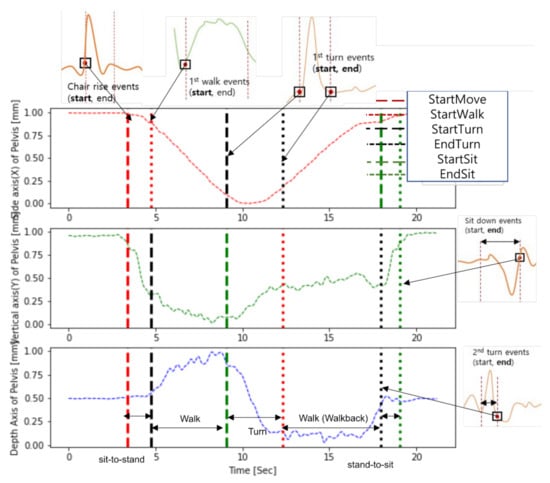 TUG events in Skeleton TUG and this study. Based on the dataset obtained in the study, it shows how the proposed method and the events of the skeleton TUG are matched, re-spectively. Each truncated plot is the result of detection of the event of the skeleton TUG.