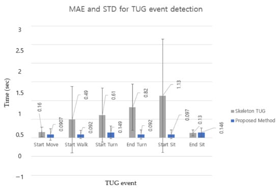MAE and STD in seconds between skeleton TUG (gray bar) and the proposed method (blue bar) for each TUG event. Error bars are ± the STD of the values.