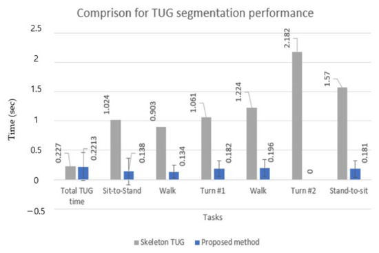 Table 5 shows that for all five subtasks, the proposed method showed significantly lower timing errors (MAE) (9–10 times) and higher F1 scores. This means that the proposed method had a better classification performance for the multiclass classification task with imbalanced data, such as the TUG test, in which data were collected in an unbalanced form because the execution time of each activity was different for each subtask. However, in the total TUG time, precision, and F1 score were slightly better in the skeleton TUG than in the proposed approach. This may be because the skeleton TUG had a clearer criterion for sit-to-stand and stand-to-sit by their rules. In contrast, the proposed TUG in this study used the subjective criterion (45-degree inclination angle from the TUG video by two experts).