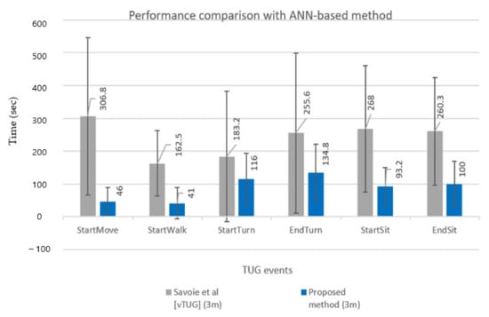 Figure 10 shows the results in a bar chart for a straightforward comparison between the two methods. The STD is also computed in the case of the proposed approach to demonstrate its robustness, whereas the STD is not calculated in [37]. The robustness of the proposed method may also be far better than that of the rule-based approach (despite no STD) if we consider the robustness of the TUG event detection results in Figure 9.