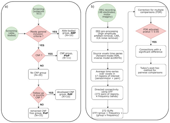 The study is a registered clinical trial (clinicaltrials.gov identifier NCT021789917, accessed on 9 June 2022). People with subacute SCI and satisfying the general inclusion criteria of age 18–75 years, ability to understand the task, and absence of other major neurologic disorder or injury (i.e., stroke, brain injury, epilepsy, multiple sclerosis, cerebral palsy, etc.) were screened for the study. Among the participants screened, the first 11 participants with CNP were recruited. The presence of CNP was confirmed following the criteria by Finnerup et al. [30]. In total, 20 participants with SCI and no CNP were further recruited based on the published literature showing that half of the patients with SCI eventually develop pain within the first year of SCI [31,32]. Then, 10 able-bodied volunteers were recruited for the study with the same general inclusion criteria. Therefore, three groups were formed initially: 10 able-bodied people, 11 people with sub-acute SCI and CNP, and 20 people with subacute SCI and no CNP.
